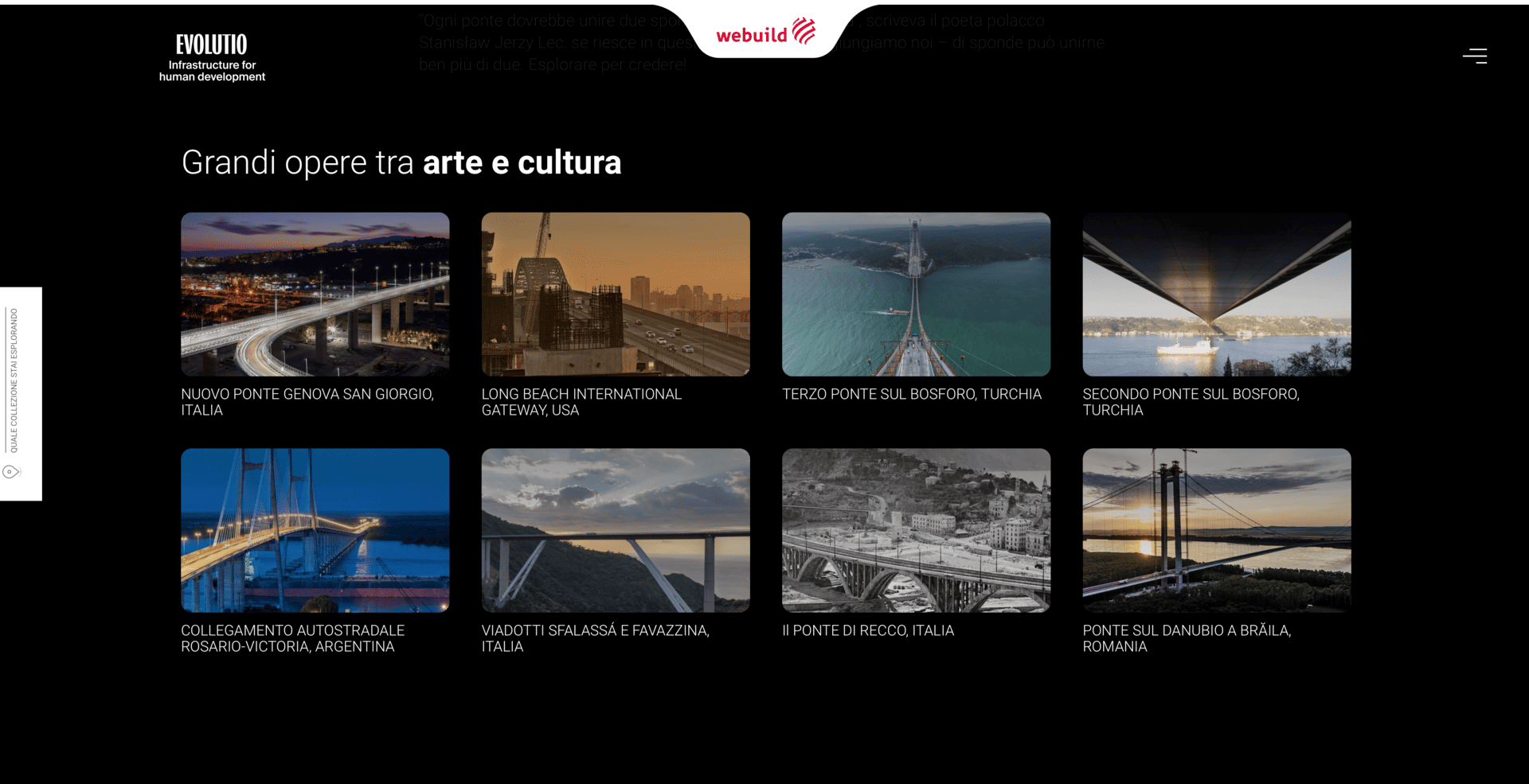 Evolutio is therefore not merely a communication initiative, but a declaration of identity through which Webuild – which over 120 years has completed more than 3,700 projects in 50 countries – chooses to share with the public a legacy made of construction sites, ingenuity and progress.