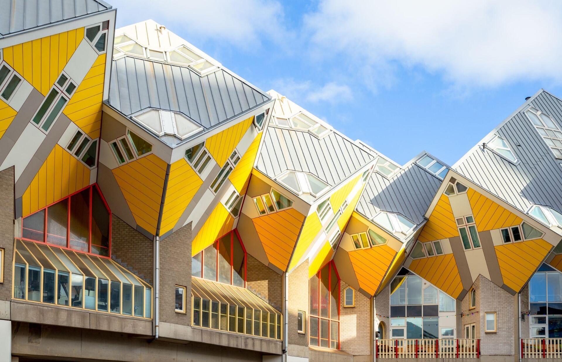 Negli anni Ottanta, a Rotterdam, l’architetto Piet Blom progettò le celebri “case cubiche”, un insieme di edifici con cubi inclinati sorretti da pali.