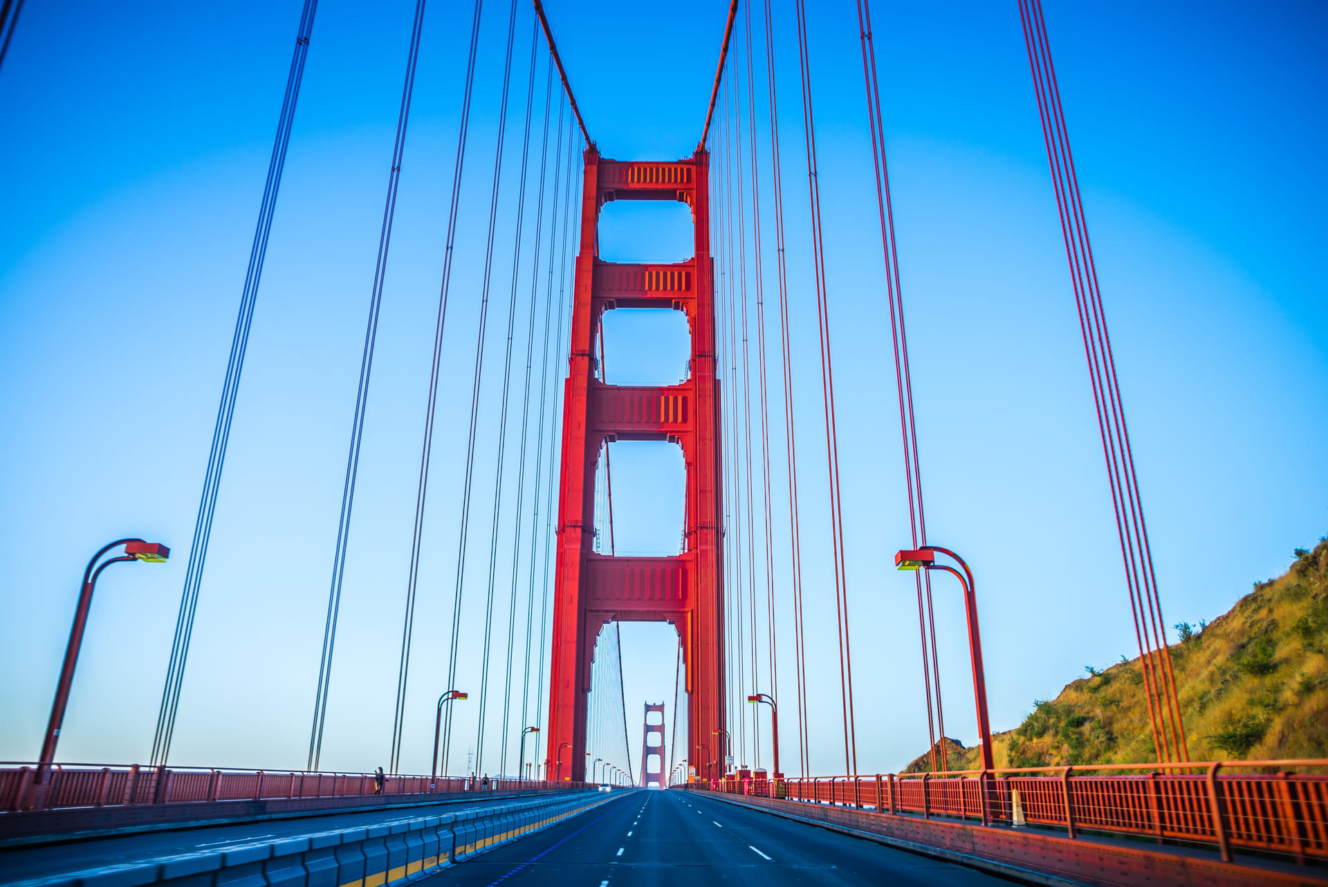 E, ancora, la lunghezza del cavo principale (2.332 metri) e la composizione stessa di ogni cavo, fatta da 27.572 fili che, se venissero stesi uno dopo l’altro, avvolgerebbero la Terra più di tre volte.