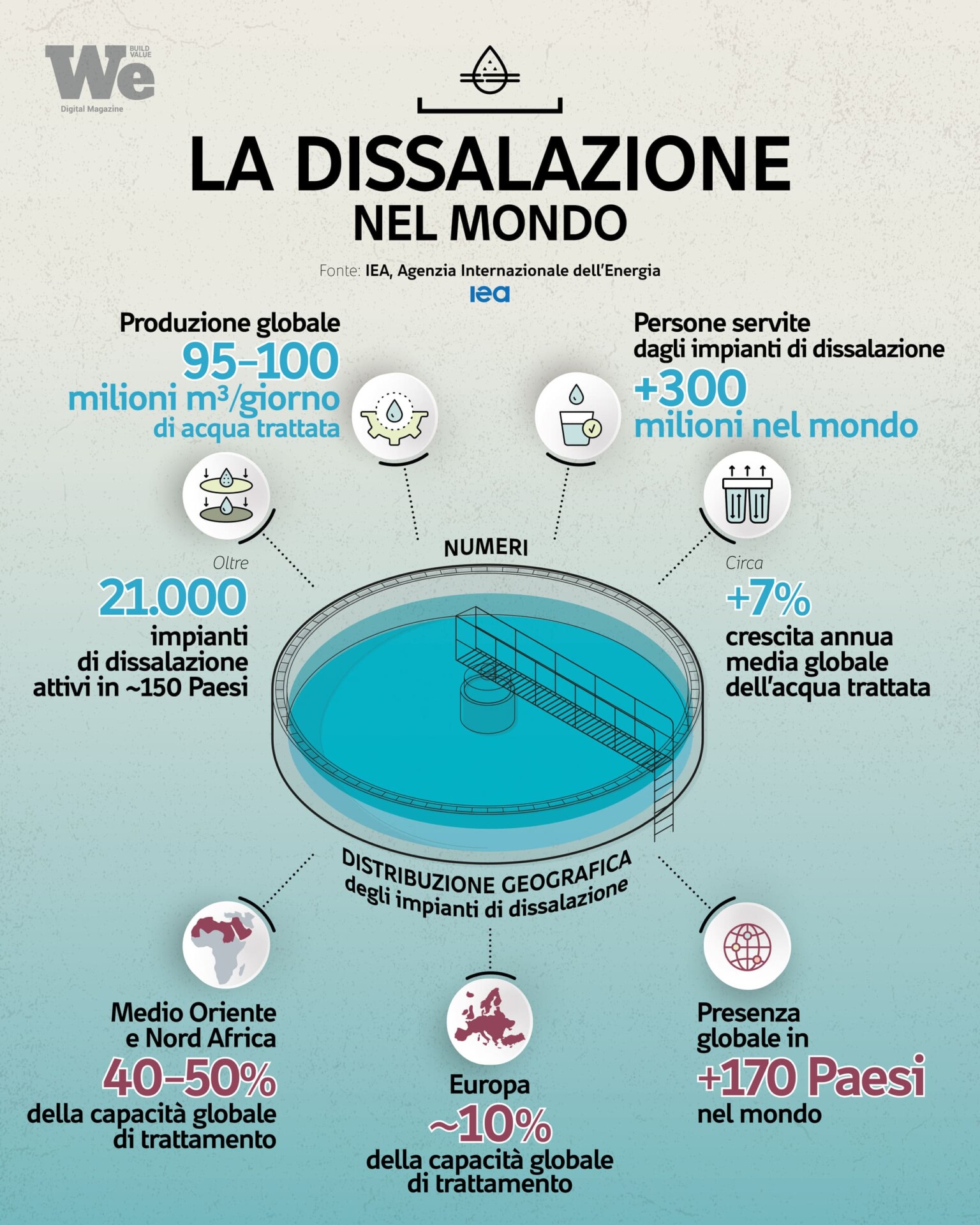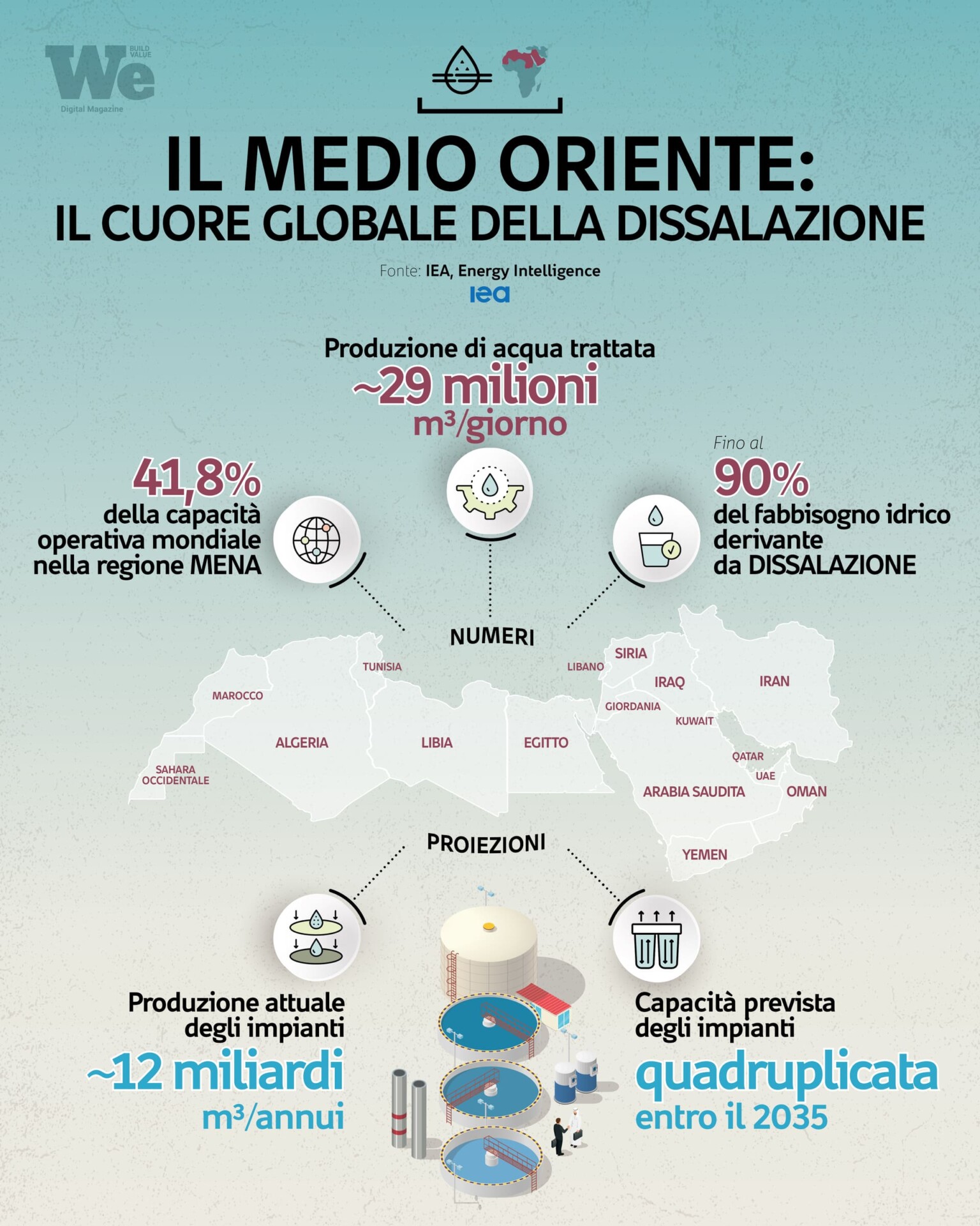 L’area Medio Oriente e Nord Africa concentra oggi più del 40% della capacità globale, con una produzione che sfiora i 29 milioni di metri cubi al giorno. L’Arabia Saudita da sola vale circa il 22% del totale mondiale, con quasi 10 milioni di metri cubi quotidiani.
